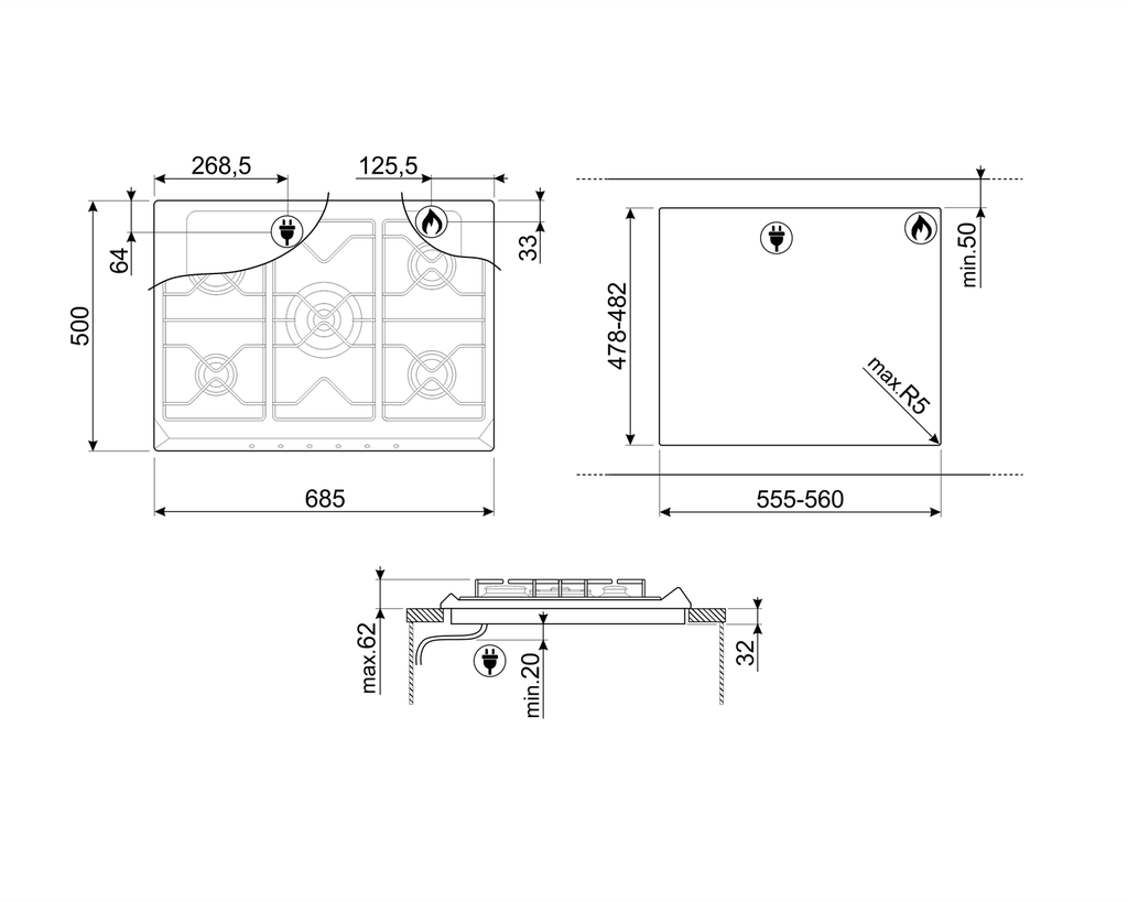 - Kích thước bếp: 685 × 500 × 32 mm