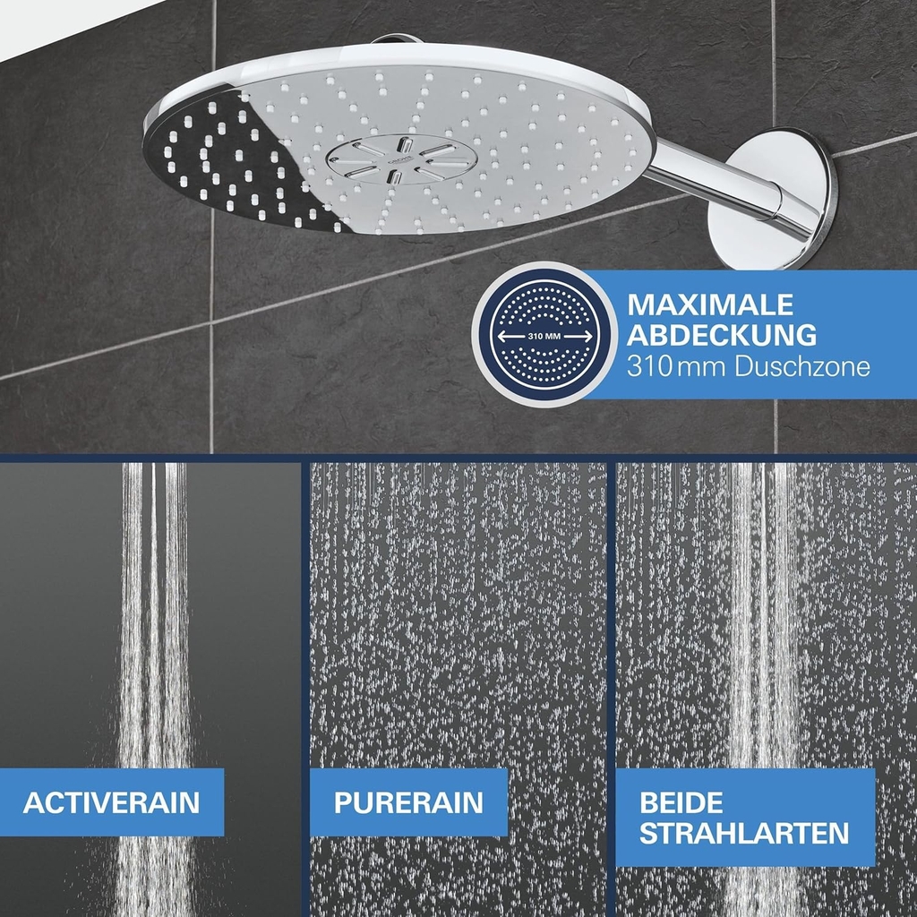 - Đầu sen mưa Vitalio SmartActive 310 mm: Cung cấp hai kiểu phun – PureRain (êm dịu) và ActiveRain (mạnh mẽ), mang đến trải nghiệm tắm thư giãn và sảng khoái.
