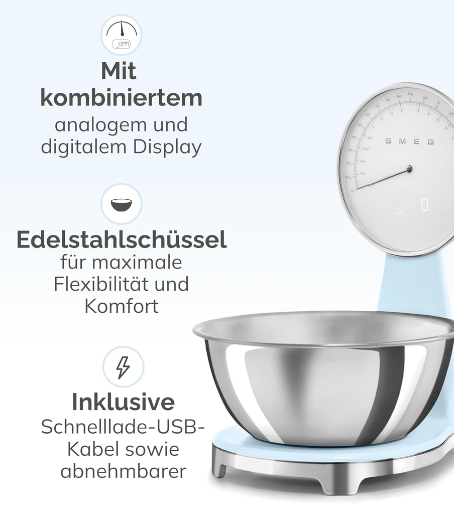 Bát cân làm từ thép không gỉ, dễ dàng vệ sinh vì có thể rửa bằng máy rửa chén, đảm bảo vệ sinh và chống bám mùi. Mặt đĩa cân tương thích với bát của máy trộn Smeg, mang đến giải pháp tích hợp giúp đơn giản hóa quá trình chuẩn bị món ăn yêu thích của bạn.