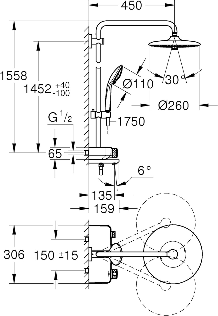 - Lưu lượng nước sen trần: tối đa 20 l/phút (3 bar)