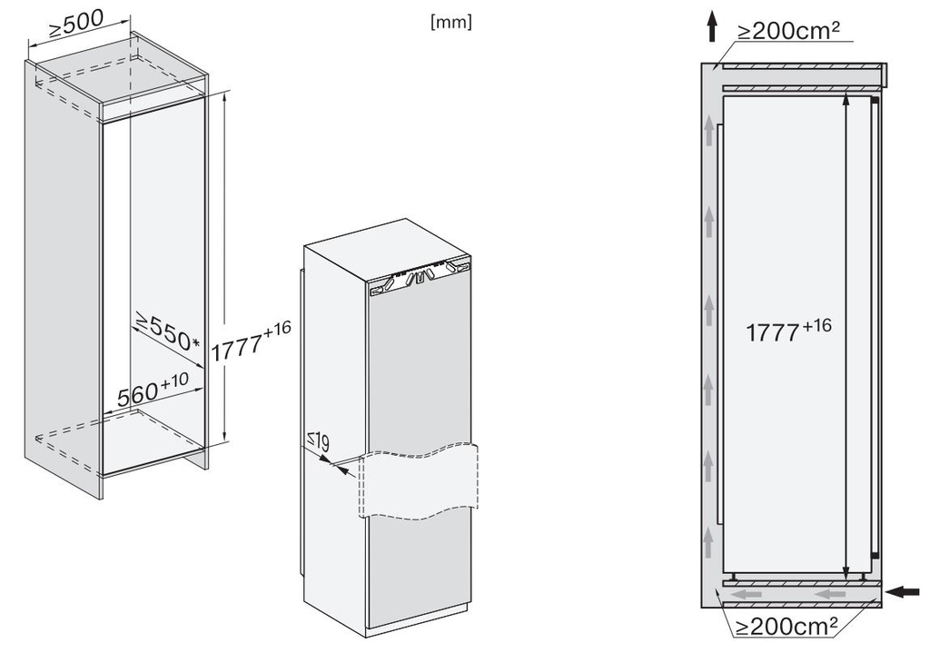 - Kích thước khoang lắp đặt: Cao 1777–1793 mm x Rộng 560–570 mm x Sâu ≥ 550 mm