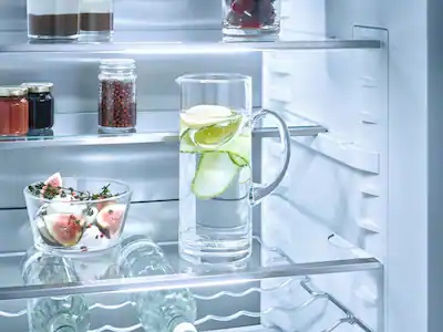 - Đóng cửa thiết bị nhẹ nhàng. Cửa tủ lạnh và tủ đông tự đóng êm như thể: với SoftClose, hệ thống khóa cải tiến của Miele. Cửa tự động đóng từ góc 30 độ. Ngoài ra, SoftClose làm giảm độ ẩm cho cửa khi đóng - không còn tiếng chai kêu leng keng ở cửa bên trong.