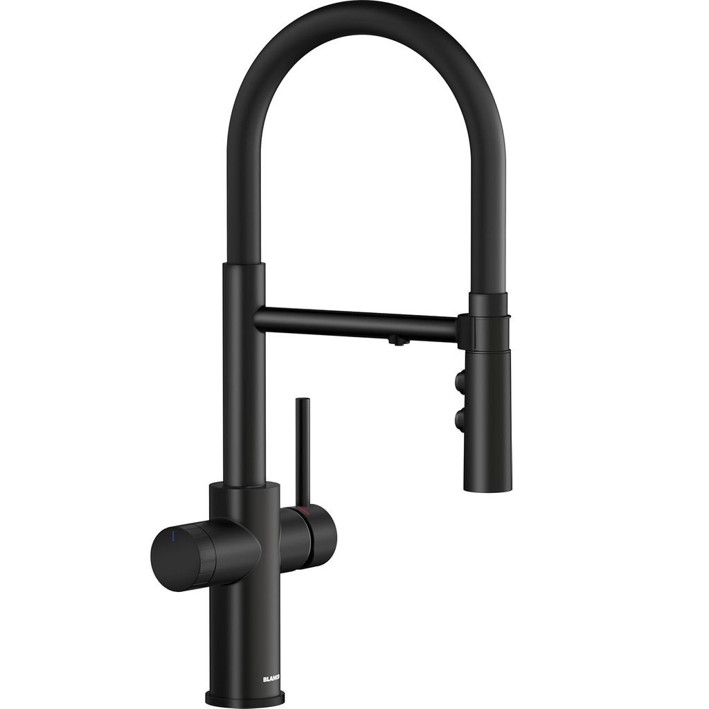 Vòi Blanco Catris-S Flexo Filter là lựa chọn cao cấp cho gian bếp hiện đại, kết hợp nước nóng/lạnh và nước lọc tinh khiết trong cùng một thiết bị. Thiết kế 3-trong-1 theo phong cách bán chuyên nghiệp, hoàn thiện sơn đen mờ sang trọng, vừa tiện dụng vừa thẩm mỹ.