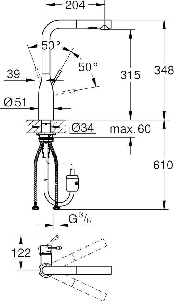 - Cổ vòi: Dạng chữ U, xoay 360°